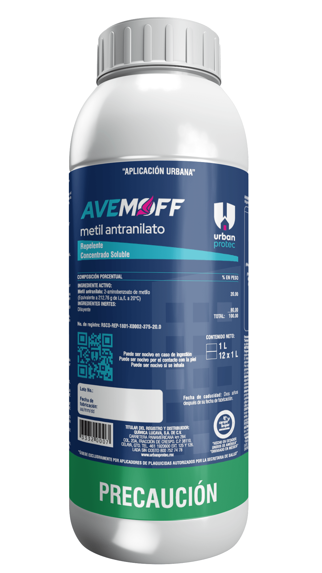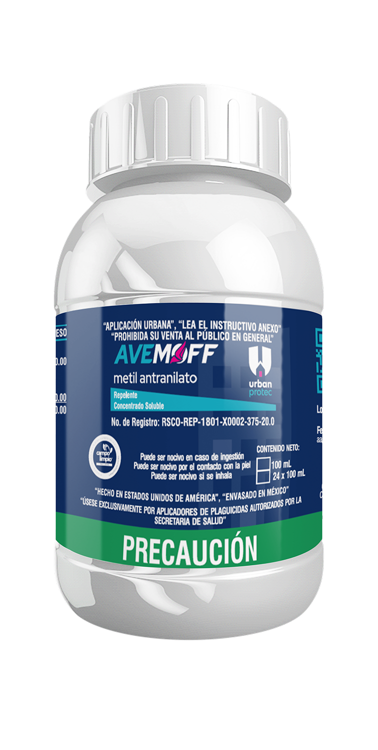 Repelente sensorial a base de metil antranilato para disuasión de aves en interiores y exteriores.